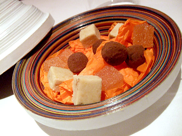 Some mignardises, chocolates, pates de fruit and a third item I didn't taste, gave me time to digest and reflect. Needless to say, I felt it was a truly wonderful meal. Unlike our previous experience at Izote, which ran the gamut from wonderful to awful, our dishes at Pujol ranged from outstanding down to merely very, very good. Pure, bold flavors just work in a minimally-presented fine dining context, and that's exactly Olvera was doing. Though his dishes were almost exclusively classed-up versions of downscale foods, the irony is that in many ways the application of complicated, refined technique actually made the dishes simpler. In terms of presentation, of course not. But the flavors were clean and distinct and pure, as though the dishes he was emulating in his personal fashion had been distilled down to their basest essence before being prettified for an upscale table. In searching online, it was clear that "Izote or Pujol?" is a very common question for food geeks en route to the D.F., and while I generally try to avoid such comparisons and would need to apply the caveat that all bets are off during chiles en nogada season, I know where I'm going nine times out of ten. Pujol is definitely one of the year's dining highlights for me.