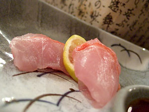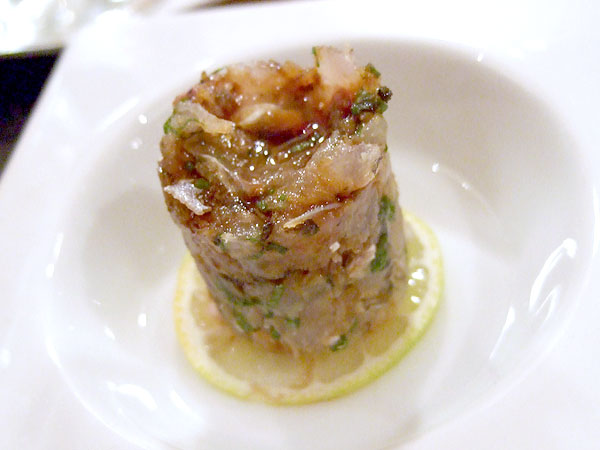 The last column started with another that was new to me, a mackerel tartare with chives, ginger and tiny bits of the fried bones of the fish. That last item will, I've no doubt, be somewhat off-putting to some, but it absolutely worked for me, providing a truly unusual textural contrast. That the mackerel was a beautiful specimen didn't hurt. Next up was another old Nobuo standby, the hirame carpaccio drizzled with sizzling ginger and garlic oil, topped with sesame and served atop a slice of fresh bread. Though I prefer its original presentation, where you eat the fish and then use the bread to mop up the oil in which it's been swimming, it was nonetheless delightful to see the reappearance of an old favorite. And per Nobuo's instruction, rounding out this amazing spread was another old classic, the hamachi with grapefruit, avocado, ponzu and white truffle oil. It's still a killer combination, and a great citrusy finish to an amazing collection of some of the most unique sashimi you're likely to have anywhere.