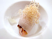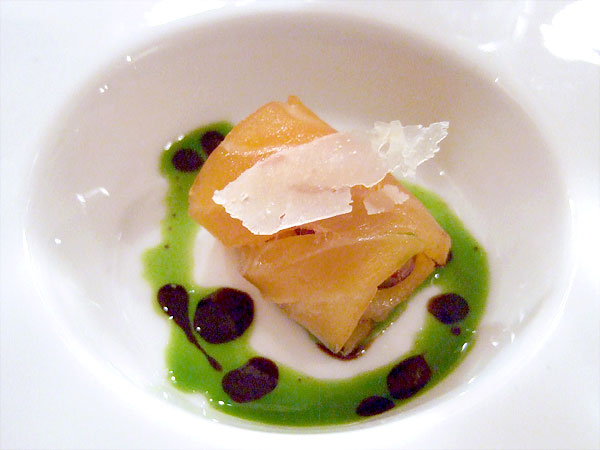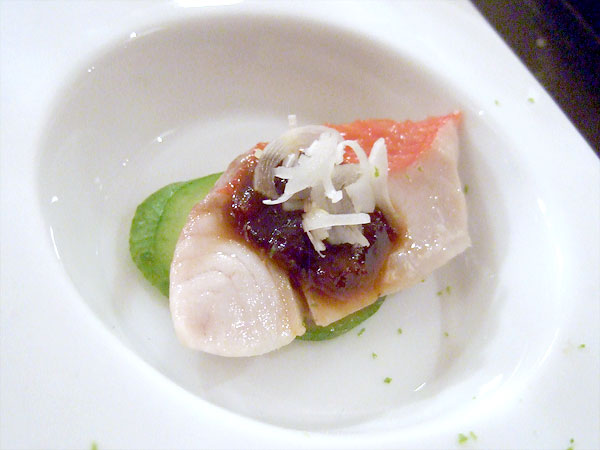 The next vertical column starts with another old Nobuo East-West standby, a slice of luscious house-cured salmon wrapped around an almond, dressed with basil oil and a spritz of balsamic, and topped with a flake of nutty pecorino. Really, it's Eastern sensibilities and presentation applied to Western ingredients, and it absolutely works. Down from there was another of my most favored bites, one that I'd had from Nobuo before, but not this good. It was octopus set atop a slab of creamy fresh mozzarella and a slice of sweet tomato, swimming in olive oil and topped with a tiny dollop of aioli and crispy pink peppercorns. Such delicate Western flavors are really an inspired foil for octopus, and the textural contrast between the octopus and the fresh mozzarella is shockingly less than you'd think. Incredibly tender and painstakingly scored every couple of millimeters (a common Japanese treatment for tougher cuts and a brilliant display of knifework), it barely puts up a fight at all, almost melting into the other ingredients. The final item in the center was another I'd tried on our previous visit, hamachi ceviche wrapped around pickled miyoga (a type of ginger) and shiso, and topped with crispy taro threads. I loved as much on this pass as I had on the previous one.