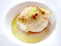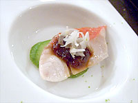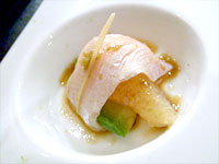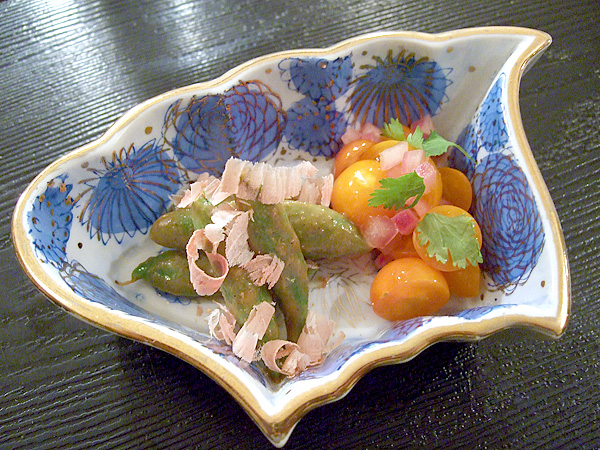 The first offering was a cold hassun dish -- a simple, fresh preparation meant to set the seasonal tone -- that featured sugar snap peas and sungold tomatoes from a local farm. The sugar snap peas, sweet and crisp, were lightly dressed with a sesame sauce and topped with curls of bonito, shaved into an antique-looking wooden box from a dried and smoked side of fish that looked like a piece of lacquered wood. The tomatoes, which popped with a lightly acidic bite, had been vinegared and paired with bits of onion or shallot, I'm not certain which. Though I was struck by the subtlety of the bonito and the tomato ceviche's "cure," in both cases it could not have been more abundantly clear that this was a dish that was all about the centerpiece ingredients themselves, those perfect little morsels, presented like the Olympian ideals of the sugar snap pea and the sungold tomato, with just enough of an accent to bring out their best. Ingredient-focused, indeed.