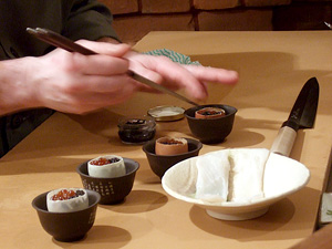 Though not a kaiseki menu in the strictest traditional sense of the term, Nobuo's omakase is formidably elaborate. The first clue that this will be a meal of exceptional style and attention to detail comes in the form of a rolled parchment scroll, where chef himself has handwritten the evening's menu. It's a beautiful thing to behold, even if it will be impenetrable to most. A year and a half of high school Japanese netted me half a dish. The rest was a mystery. Which was just as well, since I'd usually rather just be surprised anyway. Shortly after sitting down and receiving our menus, Nobuo got to work, preparing dishes with a calm, measured pace that stood in stark contrast to the lightning-quick acrobatics that most chefs seem to cultivate when working in a show kitchen. After all, what's the rush? You're here to enjoy yourself.