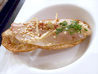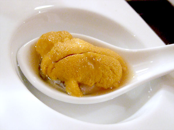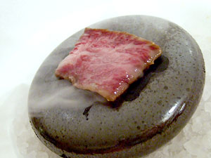 After such an elaborate and complex presentation, it only made sense that the next couple of courses leaned towards zenlike simplicity, though they certainly sacrificed nothing in terms of flavor. First, washugyu ishiyaki -- sweet marinated slices of short rib cooked atop a searing hot rock along with Japanese scallion. This was true Wagyu, we were assured, no American Wangus hybrid, and though I'm of the opinion that the latter has its own charms, this helping tasted, indeed, like the premium beef that I've had the good fortune to try in Japan on a couple of occasions. It's almost like the foie gras of beef, as though you've taken an already delicious cut and magically crammed as much silky, succulent fat into it as is physically possible. A scant few slices may be all you get, but really, that's all you need. Something like this is better savored than devoured.