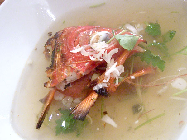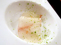 The beef was followed by a sort of two-part dish featuring the kinmedai that made an appearance on the sashimi plate. Shabu shabu, for those unfamiliar (since this particular delight regrettably has yet to make an appearance in the valley), involves lightly cooking slices of meat, fish or vegetables at your table in a very, very lightly seasoned broth. We started with a few thick slices of the kinmedai, presented next to a paper bowl of broth gently simmering over a small grill. The kinmedai was of absolutely unimpeachable quality, and needed just a few swift strokes through the broth to gently coax a little cooked flavor out of the exterior, while leaving the interior delightfully raw. A tiny splash of ponzu finished the dish, but the dish was by no means finished.