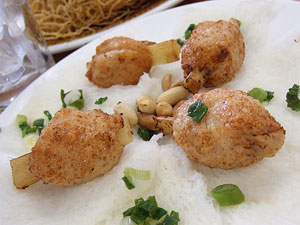 My lone disappointment so far has been the Banh Xeo, a fried pancake filled with pork, shrimp and bean sprouts. It's almost exclusively bean sprouts, and though I appreciate the low price tag, I'd personally prefer they charge an extra dollar or two and get at least a little more pork or shrimp in there. And while I realize there's a balance to be struck between crisp and soft, this got rather doughy in spots. Though better than most of the others I've had in town, it still leaves me wanting. Chao Tom, blended shrimp and pork fat formed around sugarcane and cooked, is a little more successful, though the precise method is a mystery. They're a little singed in places, but they don't have any marks that would indicate they were grilled. Broiled, perhaps? Strange. And I found the seasoning a touch weak. But still, they're quite good, and I particularly enjoyed the inclusion of Banh Hoi, intricately woven sheets of rice noodles that are great for wrapping and dipping along with the requisite herbs and vegetables.