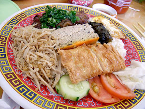 Or sometimes I prefer my assortment of Vietnamese meats and vegetables over Com Tam, or broken rice. The house megaplatter is the Com Tam Thanh Dac Biet, which crams as many little components onto the plate as possible. The same barbecued pork patty mentioned above is present, as well as a ton of other items. On the left, my lone disappointment, slivers of stir-fried pork that were very, very dry and lacking flavor. But the rest of the plate was a joy. The top of the two items in the center is a tasty spongy crab and egg patty, to the right of which is Bo Nuong La Nho, seasoned ground beef wrapped in grape leaves and grilled. It's a shadow of the dish on which it's modeled, Bo La Lot, but since I haven't been able to find a place that does it with actual betel leaves, I'm going to assume this is a supply issue. But if anybody finds true Bo La Lot, please let me know. As Wandering Chopsticks once put it, substituting grape leaves for wild betel leaves is like substituting lettuce for basil. My favorite item on the plate is the Tau Hu Ky, a cooked shrimp paste not unlike Chao Tom, but wrapped in paper-thin bean curd and fried. This is a textural delight, delicate and crisp and delicious. Round out the platter with some pickled cabbage and a fried egg, and it's tough to find a better way to spend eight bucks.