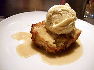 Bread pudding was much more successful, titled "Pig in the Orchard" for the combination of apples and bacon therein. So yes, both of my desserts featured bacon. And while bacon works great in a dessert context, I really hope we're getting past the "Ooooh, bacon dessert!" phase of the bacon craze so we can enjoy it with just a little less ubiquity. In any case, it was a nice bread pudding, a little cakey and not quite as moist as I'd like, but very tasty, with cinnamon ice cream, an intensely sweet bourbon brown sugar sauce, chunks of tender apples and the aforementioned bacon, crusted on top, which was subtle enough that it could almost slip by unnoticed. It hit a nice balance of sweet and savory, nailed a la mode's always successful warm and cold contrast, and made me happy, if a little overstuffed. But there, I can only blame myself.