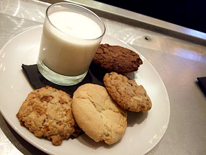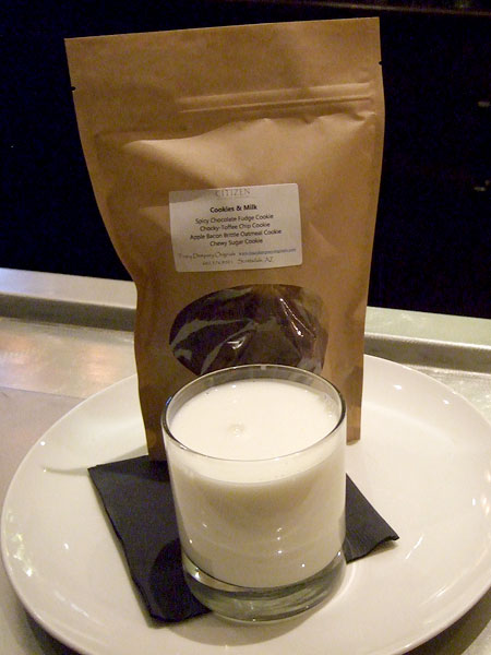 Desserts, done by Tracy Dempsey, are pretty straightforward, and the first I tried was the most straightforward of all, the milk and cookies. What you see here was my artful arrangement to allow you to actually see the cookies. In reality, they arrived at the table like this, a sealed bag unceremoniously set on the plate next to a glass of milk. Sporting such specimens as spicy chocolate fudge and an oatmeal variant involving fruit and bacon, I enjoyed the cookies, but was a little put off by the presentation. Not because I thought it indelicate. I actually kind of liked the humor of it. But gosh, it sure would have been nice if the cookies had been warmed, maybe... anything to separate it from something you might just pick up off the store shelf.