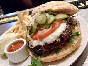 Though the sandwich selections include a BLT, Wagyu burger (THANK YOU for not calling it Kobe, guys) and an interesting-sounding grilled halloumi, I couldn't get away from the lamb burger, and I'm glad I didn't try. Gussied up with tomato, pickled cucumber and onion and a light tzatziki, what made it was an absolutely beautiful patty, medium rare, moist, dripping with juice and screaming fresh lamb. Big, intense lamb flavor, accented by the condiments rather than dominated by them, and rivulets of lamb fat streaming down to your elbows is a recipe for success, as far as I'm concerned. Sitting on a bun with body and paired up with some pretty decent fresh fries and a house made ketchup, it's one of the best burgers I've had of any stripe in quite a while.