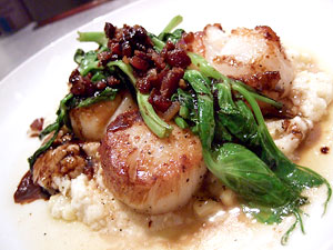 The pan seared scallops suffered the opposite fate. Served atop grits with "lardons," snow pea greens and a red rock cola gastrique, it could be more aptly described as scallops with butter. If there was less than three ounces of butter on the plate, I'll turn in my (non-existent) credentials. But I have no issue with an abundance of butter. This was not the problem. Nor were the grits, which were creamy and studded with kernels of fresh corn, nor the greens which were wilted but retained their fresh flavor, nor the lardons which... well, they ended up coming across less like lardons and more like bacon bits, but even this wasn't a problem since they added a little bit of crisp texture. The problem was simply in the cola gastrique. Or, more accurately, the problem was in the absence thereof. The scallops were so incredibly rich, saturated with butter and bacon, that they needed the gastrique's acidity to keep them from crushing you under their weight. The few bites I had with the gastrique were fabulous. But there was only enough gastrique for a few bites. It either needed to tone down the richness, or bring on the gastrique. I vote the latter. But again, I still rather enjoyed the dish despite this issue, and those few fully-composed bites were dynamite.