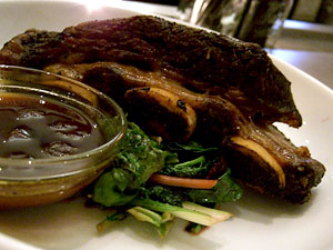 The two entrees I tried were flawed, but close enough that it wouldn't stop me from getting them again. the Coffee Charred Short Ribs, flanken cut, put up a bit of a fight, and I mean that as a compliment. They were tender, to be sure, but they hadn't been stewed to death, possessing not only just a little bit of satisfying chew, but a crisp, smoky bark that gave it even more textural interest. Plated with a simple but tasty roasted parsnip puree and an assortment of sautéed green vegetables, the problem was with the sauce. Billed as a "dried cherry BBQ sauce," the flavor was on, but there was much, much, much too much of it. It was absurdly sweet, almost candylike, and the only thing that kept it from being completely unpalatable was a certain amount of balancing sourness which took it from inedibly sweet to way too sweet and sour. "I was tasting it an hour later" is a tired piece of critical hyperbole, but here it wasn't hyperbole. An hour later, I couldn't get that sticky sweetness out of my mouth. Its most redeeming quality was that it was wisely served on the side, to allow for careful application. And it's a shame, because the quality of the flavor was right on. It was just way too intense. But everything else on the plate was delicious, and just a little reworking of that sauce would make it a great dish.