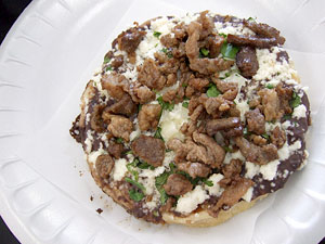 Of course, this is a Oaxacan joint, so there are some offerings that may strike some as less familiar, too. The aforementioned molotes are a nice choice, a Oaxacan holiday food that's available year-round here. A thin disc of masa is stuffed with a potato and chorizo mixture, fashioned into a kind of torpedo shape, deep fried, and then given the same beans/lettuce/crema/queso treatment as the tacos dorados. Despite the inclusion of chorizo, these fellows are actually quite mellow, a kind of pleasantly warm and starchy package with a nice, crisp crust. The memelitas are another pick-your-masa variant, here a thick disk with crimped edges, spread with beans and queso fresco and topped with the meat of your choice along with a touch of onion and cilantro. This thing's got some body, and it has the added benefit of combining the almost crunchy griddled masa of the underside with the lighter and moister top, cooked only by radiant heat from underneath.