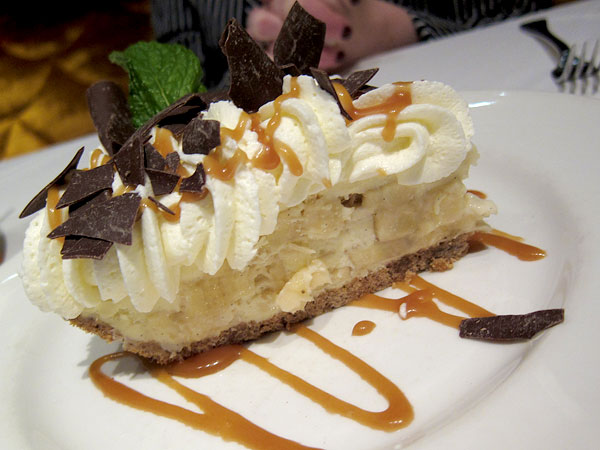 The object of my ladylove's desire (and, to be fair, mine as well) was thankfully still on, however. The banana cream pie isn't exactly elegant, but it's an old favorite that I hadn't had in years. Graham cracker crust, piled with whipped cream and chocolate shavings and drizzled with caramel, the joy of this slice is in the filling. While I can't say I've sampled enough banana cream pie to say whether this is a revolutionary or simply a rarer approach, the filing is 90% fresh, sweet, cold bananas rather than a custardy mess. There's a little bit of light banana mousse to bind them, but it's mostly huge chunks of unadulterated fruit, which makes it play light and refreshing... a feat considering the amount of sugar involved in its production. I may not be approaching this from a place of objectivity, but I say this pie still rocks, even if the surrounding restaurant has completely changed around it.