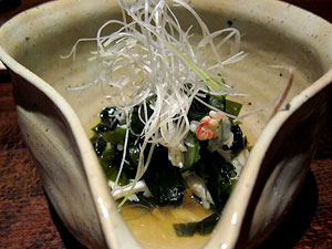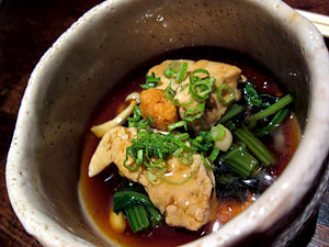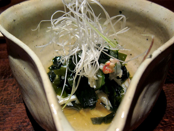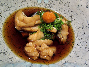 We were delighted to discover that the nogoduro would make an encore appearance, here fried and served with chili daikon and scallions in a dashi broth. Simple as it was, this was in the running for my favorite of the evening. The fish was beautiful, cut to increase the surface area which was fried to a golden, lightly crisp and tasty crust. Just as wonderful was the dashi, this time a little sweet and sour, but bursting with flavor and perfectly matched to the fish. Here's where I feel compelled to point out the incredible variety of dashi-based sauces we consumed. I realize I'm writing dashi, dashi, dashi, and that seems to be the primary component every time I mention it, but that doesn't begin to express the range of flavors covered by these dashi-based broths and sauces. The truth is, I lack the knowledge to articulate the procedural differences between them. But know that this dashi is not the ankimo dashi, which is not the tofu dashi, etc. They're so remarkably distinct, I'd love to sample them all side-by-side to fully appreciate the differences, both subtle and not so, between them. In any case, as mentioned, this dish may have been my favorite.