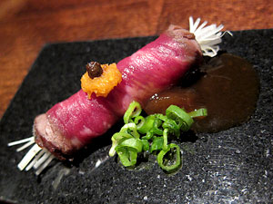 Next up, a little Wagyu tataki (I'm going to gloss over my annoyance that it was billed as Kobe). There were actually three of these little bundles, but... uh... I snarfed one of them before remembering to take a photo. The other two looked almost exactly the same, a thin slice of briefly seared beef wrapped around some manner of thinly slivered vegetable with various accompaniments. In Japanese style, we were directed to eat from right to left, starting with a simple roll accompanied by a bit of green tea salt. The second added crispy fried slices of garlic and a single sansho berry (the sharp and uniquely astringent Japanese pepper). The third, pictured here, was topped with some chili daikon, more sansho, minced green onion and ponzu jelly. All three featured some beautiful, mostly raw beef and perfectly crisp vegetable filling, and the flavors followed a satisfying progression, from salty and herbaceous to garlicky and peppery to spicy, sweet and tart.