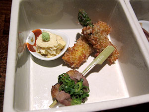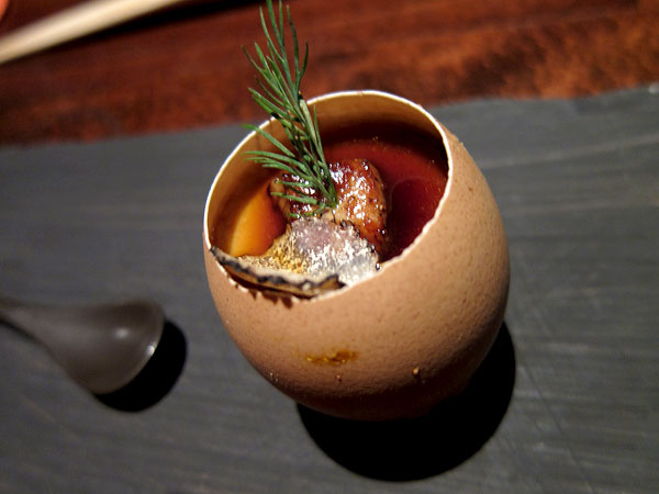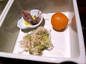 The next dish arrived in a cubic serving piece, uncovered and unstacked to create the side-by-side presentation you see here. I suppose this would be most accurately identified as the hassun course, a number of small bites meant to set the seasonal tone. On the left, we started with a tiny dish of yuba, the curdled skin that forms atop soy milk when tofu is made, with a dash of soy and more grated wasabi. It was creamy but firmly set, with the faintest sour notes and a kind of luscious, milky body. And it was about the size of the tip of my thumb. To the right of the yuba was a stalk of asparagus, halved and coated in crushed rice before being deep fried. The asparagus was crisp tender and vegetal, while the coating was exceptionally crunchy, almost like a rice cracker, unevenly textured and very flavorful. On the bottom was a slice of duck breast that had been treated to the robata, picking up a clean smoky flavor and a little bit of scallion for brightness. Moving on to the right, the item on the bottom was a piece of eggplant roasted so soft that it was incredibly creamy, almost dissolving into liquid in your mouth. Topped with a bit of shaved bonito and stuffed with ginger and, I believe, a bit of shrimp paste, it was a fabulous bite. On the top right was a tiny, vinegared baby squid with a dollop of yellow sauce described as a mix of egg yolk and "bonito guts." The squid was very cleanly marinated, tasting simply of squid and vinegar, and the sauce was a sultry little combination, taking richness from the egg yolk and a briny saltiness from the bonito. The final item was a ball composed of the same egg yolk and bonito guts combination, topped with a thin slice of salmon sashimi. It had the consistency of a hard-boiled egg yolk and was of similar size, but the bonito guts and salmon made it into a briny, slightly funky version thereof. It was a little intense. Though very small, I ate it in four or five bites. To eat it all at once would have been a little much.