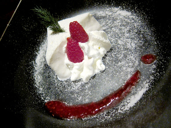 Dessert was no slouch, but I was more entranced by what was served alongside it. We received the chef's "cheesecake," a somewhat liberal riff on convention as I don't think I've ever had one so soft and loose. It was, however, unusually delicious, and simply paired with a couple of fresh raspberries and a sweet raspberry puree. What knocked me over, however, was the sake it was served with. Though not pictured, an elegant piece of stemware was filled with an almost opaque, dark amber liquid, topped with a dollop of fresh cream. The amber liquid was aged mirin -- a sweet sake -- and we were told to swirl in the cream before drinking. It was ice cold, and tasted shockingly of coffee, though I understand none was used in its production. But of course, this was no stand-in for toddy. It had the kind of punch you'd expect from something that was 14% alcohol by volume, and it had legs, its sweetness lingering on the tongue for a while after taking a sip. And what was completely unmistakable was the fermented rice, front and center, alongside that mysterious coffee flavor. It was truly unlike anything I've tasted before, and I fully intend to taste it again. A Google search for "Fukuraijyun Hon Mirin" as listed on the label (I asked to see the bottle) pulls up a few publicly posted licensing documents and nothing more. I definitely need to figure out where to obtain this stuff, because it's really wonderful.