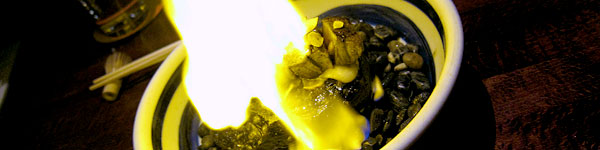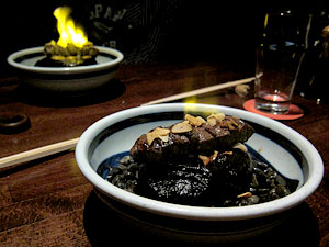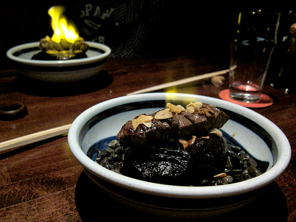 Our next dish involved some fun theatrics, and so it's pictured twice, both in the wide image above and here on the left. I had something similar on my first trip to Raku, skewered Wagyu skirt grilled on the robata and topped with crisp fried garlic chips. This was essentially the kicked-up version of that dish, tenderloin (I think?) substituted for the skirt (too bad), served ishiyaki-style atop caramelized onions on a searing hot rock, and flambéed before our eyes with... wait for it... Hennessy. It's a heck of a presentation, which wouldn't mean anything if it didn't taste great, which it does. I'm on record as almost universally preferring any cut to tenderloin, and this is no exception. But with that as a given, the beef was of excellent quality, this was a really delicious dish, and the cognac wasn't the least bit superfluous. It absolutely lent a distinctive flavor and aroma that completely changed the dish from the one I tried on my previous visit.
