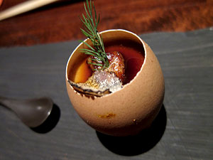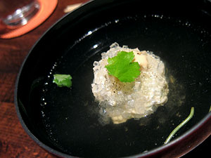 A small bowl of soup followed, a very clean and delicate chicken broth that was crystal clear and subtly flavored. Floating in the center was what can only be described as a chicken meatball, made of finely minced chicken and tiny bits of cartilage, and just the faintest hint of curry, but I can't overemphasize the subtlety of the latter. The meatball was coated in -- well, I'm not certain. It was like some manner of gelée that had been very, very finely minced and then somehow made to adhere to the outer surface of the meatball. I didn't get much from it in the way of flavor, but it did provide a very unusual texture, particularly because of the finely minced texture, that I found enjoyable if somewhat unconventional. But the dish's anchor was the broth, which achieved beautiful balance in such a light package.