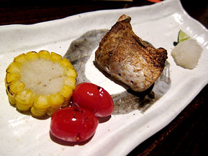 A little sea perch called nodoguro would make a couple of appearances through the meal, first served here. A small filet of the fish was folded over, skewered and grilled over the robata, leaving it moist and smoky. To pair, a little knob of grated daikon radish that we accented with soy sauce, and a tiny wedge of fresh lime. The perfect little piece of fish didn't need anything more, and could have even done with less (though the additions were entirely welcome). It was served with a couple of grilled grape tomatoes, as well as the potato with corn that had so mystified me on the first visit. Friends and I have, quite literally, sat around theorizing about how the cob could be replaced with mashed potatoes without disturbing the perfect placement of the kernels. So I asked. The simple answer? It's a matter of careful knife work. Our server explained that the chef carefully cuts away the kernels, leaving just enough cob so that they can be unrolled into a flat sheet, which is subsequently rolled around a cylinder of the mashed potatoes before being sliced and grilled. I'd still like to see this in action, but the explanation makes sense. Mystery solved!