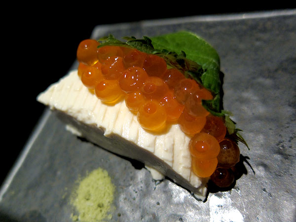 Next, we were treated to the house tofu, which was a delight of texture as much as flavor. It was served with house-cured ikura (salmon roe), and a pinch of green tea salt for dipping. The tofu itself had an unusually deep and developed flavor, and the texture was rich and creamy, almost like fresh ricotta. In fact, the flavor, though distinctively that of soy, was very much like a fresh cheese. The contrasting flavors were perfect. It got a touch of acidity, brininess from the ikura, which were exceedingly fresh and clean tasting and provided that satisfying *piff* as they burst. The green tea salt was notable for the very strong green tea flavor -- this was not a subtle flavor -- lending a distinctly herbaceous quality as well as some needed salinity. A fabulous in-house product, perfectly accented.