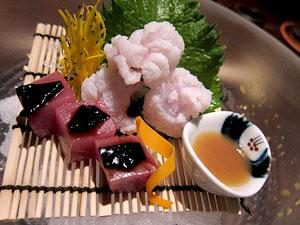One of the highlights of my previous trip was the sashimi, and while this course didn't quite live up to what I remember of that amazing yellowtail, it still featured some excellent fish, nicely accompanied. On the left, small cubes of bluefin tuna (fairly lean - no toro here) were topped with what I believe was some manner of seaweed that had been saturated with a very deep, thick, caramel-flavored soy sauce. There was just a touch, but that was plenty to accentuate the lovely fish. On top there were three tufts of eel, cooked and chilled, and served with a salty plum dipping sauce. I'm quite certain I've never had eel presented so plainly like this. How quickly we become accustomed to always having it lacquered with that thick, sweet soy sauce. But having it in this manner accentuated the texture, which was almost feathery, moist without being at all fatty (in fact, it was quite lean), and cut in such a fashion that it accentuated these qualities.