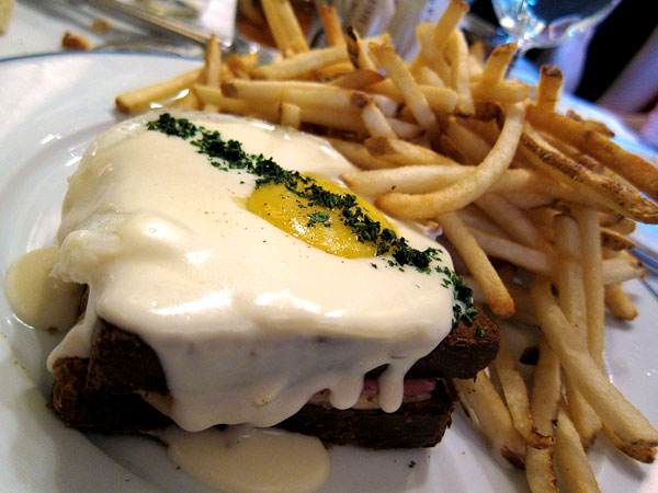 I then righted a wrong from years before by ordering the croque madame. The first time we hit Bouchon, for dinner, I gently chided my ladylove for choosing a croque madame over the myriad options available to her. Then I tasted hers and was jealous. Well, on this day, the croque madame would be mine (and hers), and while I can't say it was quite as sharp as the one we sampled in Yountville, it more than satisfied. Simple ham and cheese in the middle, bread toasted to a beautiful, light crisp, topped with a fried egg with runny yolk and smothered in a creamy, rich mornay sauce, it's really a great example of how you don't have to get cute to knock one out of the park. I inhaled it. On day one, I would have inhaled the frites as well, but this being day four, I got about halfway through them before tapping out. In my defense, there might've been three large potatoes' worth on the plate.