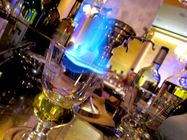 I was positively delighted to find that the dessert card also listed several selections of absinthe, which seems to be something of a signature offering of the house. I'd never had it served in classic fashion, but had always wanted to. I love anise-flavored liqueurs, and I'm a sucker for a little bit of ritual. Seemed a natural. I'd read about T.A. Breaux and was anxious to sample one of his creations, but alas, I was told they'd recently exhausted their stock. I selected Grande Absente, and once the ritual was done -- poured over a sugar cube, the sugar ignited, extinguished by a trickle of ice water that turned the clear green color to a pale milky sheen -- I was left with a light and pleasant enough drink that struck me as surprisingly one-dimensional. After poking around online for a bit, it appears I may have made a poor choice. Ah, well. Nothing was going to put a damper on a great meal, and now I'm just going to have to hunt down some of the better absinthes out there. Suggestions solicited!