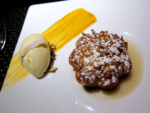 If ever there was a night to skip dessert, this was it, but I love carrot cake too much to pass on it, especially when it had just received a ringing endorsement from a friend that morning. It was a warm, spiced version, sitting in a sweet but very light coconut sauce and filled with a lightly tart cream. Carrot cake isn't carrot cake without cream cheese frosting, and this didn't disappoint. Of course, I'm not sure how cream cheese frosting would work on a warm cake, so instead it was off to the side, a scoop of cream cheese ice cream atop toasted coconut and candied ginger, a textural and temperature contrast to the cake. There wasn't anything revolutionary here in terms of flavor. This was little more than a repackaging of a classic, but it was done in such a smart way that it felt like a new take while maintaining that old familiarity.