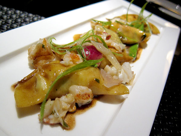 Did I mention I have a weakness for pasta with lobster? Two nights in a row, I know. I got another winner, though. Sort of. Casoncelli (one of Italy's innumerable subtle regional variations on stuffed pasta) didn't really work as pasta. Between the lobster, mascarpone, glazed spring onions, spinach puree and, I suspect, a goodly amount of butter, it was way too busy for such a thin and delicate pasta, which was almost totally lost. The Pasta Prime Directive is that pasta is, first and foremost, about the pasta, not what's in it or on it or under it. But ignore the pasta framing and approach this dish as a non-denominational dumpling? Completely delicious. Make something this tasty, and you can break all the rules you want. I'll frame it however I have to. I don't know that I'm prepared to call it Italian, but it was really, really good.