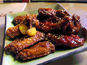 Another great shame is that I'd never had Korean fried chicken. Somehow, as we've crisscrossed the country over the past few years, we've always managed to move out a matter of weeks before a Korean chicken joint moved in. I feel like I'm leaving them in my wake. And since I feared the size of a regular order, I thought the wings might provide a decent approximation. They offer two flavors, spicy and garlic, and when I was asked which I'd prefer, I managed to cajole the staff into splitting them down the middle for me. I wouldn't do it again. I started to get the impression that it was a bigger imposition than they let on (did I mention they were super friendly?). But I'm glad I got to try both. The wings were quite crisp, with a thin breading that stayed crisp even when completely doused in sauce. The spicy wings followed a similar trajectory to the noodles -- rather hot, extremely sweet. I felt, once again, that it was just a little too much. A sauce this potent, applied this thickly felt like overkill. Half the amount and I think they would have been awesome. But I still enjoyed them. Better, I think, were the garlic wings, which had a lighter character, no matter what the two cloves of nearly raw garlic on top might have suggested. They were also quite sweet, and the garlic flavor, though strong, had a mellow rather than sharp character. I could have eaten a lot of these. On another night, I mean.