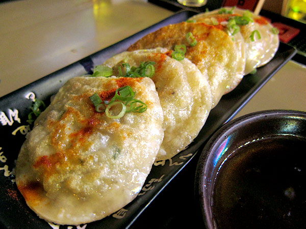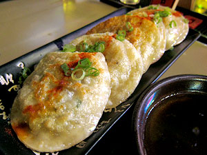 I hesitated to order the mandu. It's such a menu standard and it's usually so forgettable. But the fact that it's standard means it's one of the few benchmarks I could use, and I'd heard Soyo's were unusually good. To somebody who's probably never had first-class Korean, they were, indeed, unusually good. Nine out of ten times, I'm sure they're pulled out of a freezer bag. These were larger than those to which I'm accustomed, circular and three inches in diameter. The filling was unusually delicate, a mix of ground meat, cellophane noodles and scallions. They were pan-fried, lightly crisped in places while still chewy in others, sprinkled with a fairly hot dried chile powder, and served with a mellow vinegary dipping sauce. I dug 'em. They weren't paradigm-shifting, but they were certainly an improvement over any I'd tasted before.
