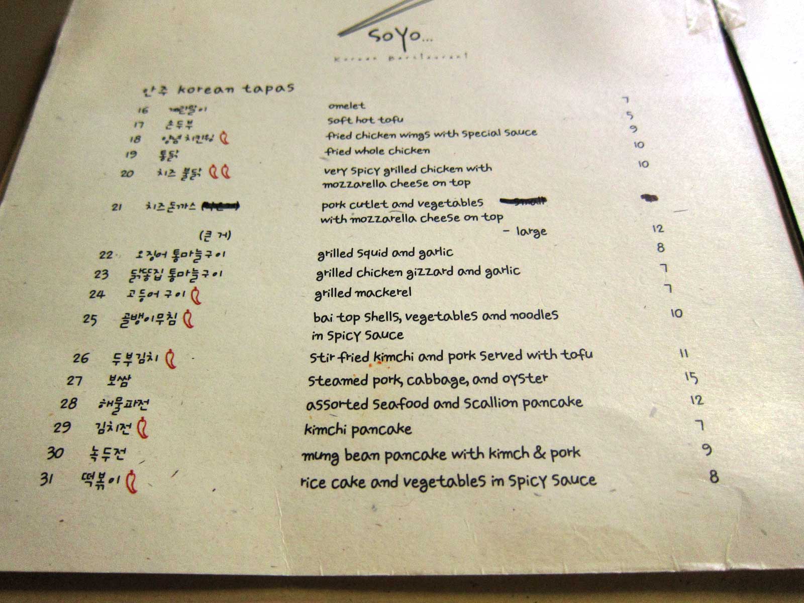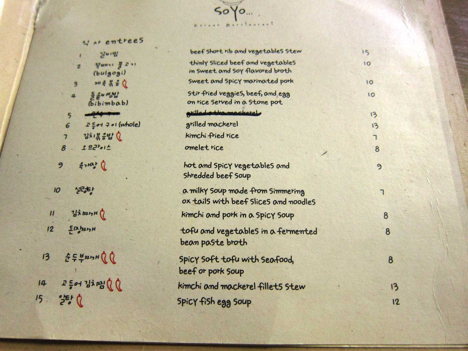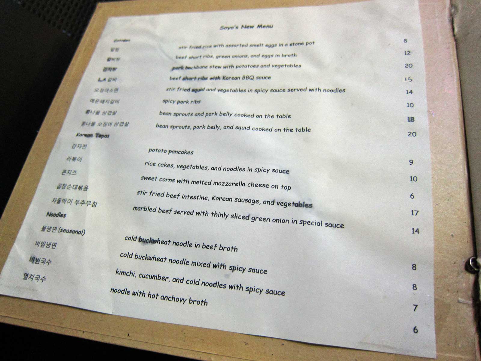 My stool was six feet from the kitchen door, and midway through I had to stifle a smile when a middle-aged Korean woman staggered out of the kitchen, pounded a Red Bull that she pulled from a cooler behind the bar in ten seconds flat, and made her way back to work. No matter how hip the house may be, one definitely gets the sense that the kitchen is guided by an experienced hand. There's so much on this menu I'd like to try, and I barely scratched the surface. I get the impression it's a good place to educate yourself, and it's a fun one to boot. Soyo's being touted as the new Raku, a late-night joint for food nerds serving authentic Asian cuisine with style. I'm not quite sure I'm willing to go that far. Raku is truly, truly exceptional. What little I tried at Soyo was good. But clearly there's something going on here, and I wish I'd been able to sample more of it. I'm very curious to hear what those who really know their Korean think of the place.