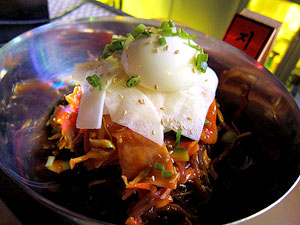 Spicy cold noodles are tricky for me to get away from, and these were no exception. They're buckwheat noodles, so sticky you first need to go at them with kitchen shears to prevent the whole bowl from coming up together. They were tossed with slivered cucumbers and carrots, topped with thin slices of daikon radish and a soft-cooked egg, and completely drowned in a sauce that was the antithesis of subtle. It was fiery hot and extremely sweet, with a fermented bean flavor not entirely unlike that of, say, hoisin sauce. Those more educated in Korean food could, I'm sure, name the precise chile-bean sauce in an instant, but I'll simply call it really, really intense. A little too much for my tastes, though I still found the dish quite good. Half the portion would have been right for me even on a normal day, and that's as much as I ate.