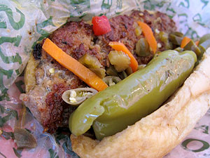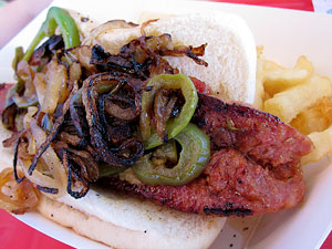 Happy as I was to see a Maxwell Street Polish, I was practically giddy to see a pork chop sandwich on the menu, another Maxwell Street standby that languishes in the shadow of its Polish brethren. When you get one of these fellows in Chicago, typically you substitute a griddled pork chop for the sausage and a hamburger bun for the hot dog bun, and everything else remains the same. Taylor Street takes a little liberty with convention, putting two thin-cut pork chops side by side on a long roll. This lame picture doesn't do it justice, because it's pretty darn good. I've had juicier and I think I prefer the hamburger bun, but this one's a fine specimen that's deliciously seasoned and appropriately dressed.