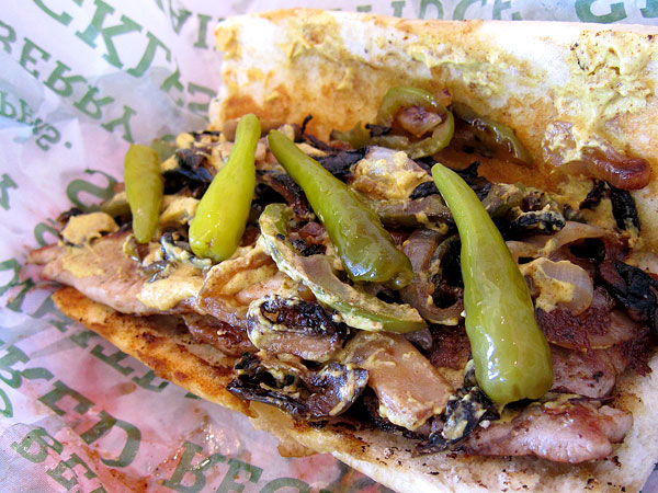 That I've even had the opportunity to be mildly frustrated by the hunt for an Italian Beef sandwich in Phoenix is a blessing. I made the mistake of turning a love into an obsession right before leaving Chicago, creating intense cravings that couldn't be even remotely satisfied in Baltimore and Boston. Then we get to Phoenix, and suddenly it's Southwest Chicago, with hot dog and beef stands everywhere. There are a lot of places around town that serve a decent dog, but Italian Beef, for lengthy reasons I'm not going to get into at the moment, is deceptively tricky to get right. And man, does Taylor Street get it right. I picked up a beef, sweet, hot and, most importantly, dipped (I try not to state opinion as fact, but I don't see the point of a dry Italian Beef). And this sandwich is fabulous. The beef is tender and flavorful, roasted fresh daily and sliced thin before going for a brief swim in the gravy (what non-Chicagoans may know as seasoned beef broth). The sweet peppers are big, lush and actually sweet, avoiding the bitterness that so many beef stands fail to avoid. The giardiniera is a good bottled variety, big chunks of peppers and vegetables with the right amount of vinegary tang and plenty of heat. The gravy is bold and well-seasoned and, in oft-overlooked fashion, contains enough oil to make the sandwich rich and succulent. Really, the only knock is the bread, which could stand to be a little more crusty and a little less spongy. But as I've mused before, the bread is the hardest thing to replicate halfway across the country, and the loaf they've chosen possesses the requisite absorbency and resilience to make the sandwich work. Bottom line is that this would be an excellent beef in the heart of Chicago, to say nothing of the middle of the desert. It's head and shoulders above anything else I've had locally... Luke's, Lobby's, Casella's, Chicago Hamburger Co., Joey's of Chicago, the now departed Al's franchise and more... this one beats them all in my book. And at $5 (an absurd price for the most expensive item on the menu), it's a steal.