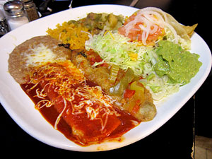 I followed that with the Mexican Combination, driven mostly by the urge to try as many items as possible. It was an enormous plate that was something of a hit and miss affair. Misses for me included the beef taco, its almost undetectable filling buried in shredded lettuce, sour cream, cardboard tomatoes and cheddar and jack cheeses. This is the kind of item that gave Tex-Mex a bad name, amounting to little more than a pile of flavorless vegetables. Better, though still kind of weak, was the chile verde con carne, chunks of dry pork stewed in an underpowered tomatillo and green chile sauce. I've sampled much better elsewhere. Rice and beans were tasty and well-made, and a beef flauta was crisp and delicious, possibly made with the same meat as the taco, but without all of the extraneous veg to get in the way. A chile relleno was also pretty good, stuffed with melty cheese and topped with some stewed vegetables that, unlike the taco filling, tasted like vegetables rather than water. The undisputed king of the plate, however, was a fabulous red cheese enchilada, warm and steamy and completely smothered in a deep, earthy sauce that was a blast of pure red chile flavor with a satisfying but non-abusive amount of heat. The menu had a large section dedicated to enchiladas, and that's where I'd focus if I were to return... and I'd return in a heartbeat, because despite a couple of misses, I really, really enjoyed the hits.