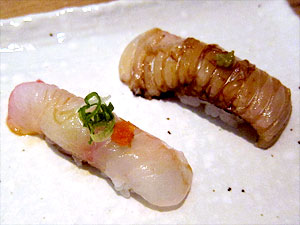 And then. Came. The nigiri. Oh, my, the nigiri. A parade of nigiri so stunning I alternated between gleeful giggling and awestruck silence. It was served two or three at a time, small pieces less than half the size of what one would typically expect, almost comical in appearance until the first bite, when the flavor of the fish comes charging through and you realize that anything more would be unnecessary. The nigiri is served in a very upscale style seldom seen in our now sushi-happy nation, where there is no dipping or condimentizing or firing up your fish with a massive wad of fake wasabi. Whatever the fish needs is applied by the chef, and when done well -- as it was here -- whatever the chef applies is exactly what it needs. We had kisu, a Japanese whiting, with a hit of wasabi lurking beneath its milky surface and lime and salt atop. We had sweet and mellow hirame, pressed between kombu for an umami boost and served with a hint of pickled plum. We had more of the stunning aji with spicy shoga (grated ginger) to play off its funkier qualities. We had succulent bigeye tuna with thick, sweet nikiri soy, enhanced with mirin, sake and dashi. We had briny orange clam touched with and requiring nothing more than a hint of lemon. We had bigeye otoro so creamy and wonderful that it made the need to leave bluefin alone for a while seem not so daunting a task. We had more. And more. And I feared the moment when it would stop.