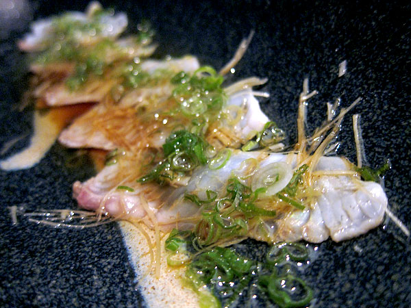 While the mirugai was a simple and pleasing start, it was closely followed by a dish that blew right past pleasing into fabulously delicious. Billed as hirame (halibut, in this case... why are fish translations always so imprecise?), we received plates of very thinly sliced fish, dressed with ponzu, drizzled with hot grapeseed oil and topped with an "onion medley." The dish was immediately reminiscent of Nobu Matsuhisa's signature New Style Sashimi, and yet it brought enough of its own character to avoid feeling like a copycat dish. The grapeseed -- a neutral flavored oil -- served to lightly sear the fish and add a certain amount of gravity to a ponzu that was already surprisingly muscular. It had a pleasant sweetness and a certain full-bodied flavor that I couldn't quite place, and the result was a light fish dish that had an almost meaty sensibility, and above all boasted incredible flavor and texture. I started to wonder if we might be in for something truly special, and then, a few scant minutes later, truly special crashed the party.