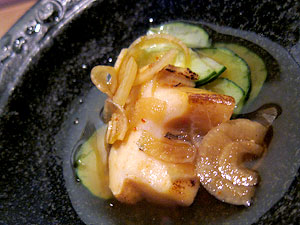 The first course, a bit of sunomono, was a small taste of mirugai (surf clam) that made for a lovely prologue. A few slices of the briny and chewy clam were paired with onion and cucumber, pickled in a house-spiced rice vinegar that lent a smooth tartness and just a touch of heat.