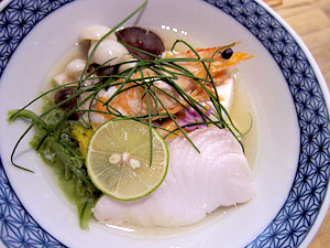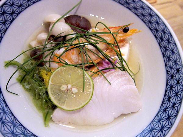 Our mushimono course was wonderfully and almost painfully delicate, sea bass and blue shrimp gently steamed in a sake broth with mushrooms, chives, lime and a soft and gentle block of house-made tofu. Though it was served with ponzu for dipping and sliced scallions and chili daikon for mixing in, I used only a whisper of the ponzu. This dish was so elegant, so gentle and so sophisticated that I hated to come blazing in with something so brash. And though every element was so precisely executed and so gently expressive -- the stunningly tender shrimp, the flaky sea bass, the melting tofu -- it was anchored by a broth that almost seemed underpowered until I took a moment to really drink it in, get my nose in the bowl and inhale, and its beautiful balance and delicate charms came wafting out. A sweet and gently enchanting dish, it was almost like a small meditation in the middle of the meal.