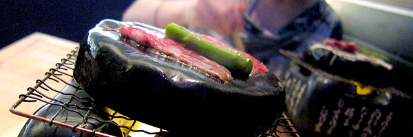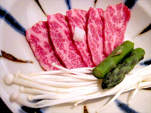 From gentle steam we moved on to roaring fire, and the tobanyaki course brought a little sizzle to the table. The toban, a glazed ceramic plate, arrived atop a small earthenware grill, piping hot and ready to cook. To add to the toban, some stunningly marbled washugyu, enoki mushrooms and asparagus, along with salt and a house barbecue sauce, light and sweet, tasting mostly of ginger and soy. But first, a small cube of beef fat hit the toban's surface with a loud sizzle and primed it for the ingredients to come. Where one goes from here is a matter of personal preference. I chose to cook the washugyu on one side only, giving it time to develop a good sear, while still leaving a bit of warm, raw beef on the other side. And alternating beef and vegetables allowed the latter to cook in the fat of the former. The sauce, while unassuming, was right on target, a perfect match for Japanese-style beef (oh, when will this embargo end?) without being so strong as to overpower it.