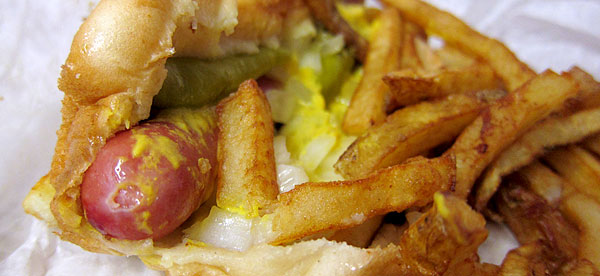 Gene & Jude's is a throwback to a bygone era of Chicago hotdoggery that existed for decades before Vienna Beef decided that to qualify as a Chicago Style Hot Dog, your sausage has to be dragged through the garden. Every time I hear somebody complain that a dog isn't authentic because it left off the tomato or pickle spear, I have to resist the urge to get rhetorically medieval on them. Don't get me wrong, I both adore and fully recognize the legitimacy of the contemporary edition (more a function of Vienna Beef marketing than the reality on the ground), but when most Chicago hot dog stands that have been in operation since the '50s or earlier eschew the more elaborate toppings, you ever stop to think that maybe that celery salt is more new-fangled than you'd like to admit? This isn't a dog with a nine item checklist. It's a depression dog, a natural casing Vienna Beef frank -- skinny one -- on a plain bun with nothing more than mustard, onion, relish, and sport peppers. That and a mountain of fries that are practically stuffed into the dog before it's wrapped in paper.