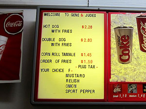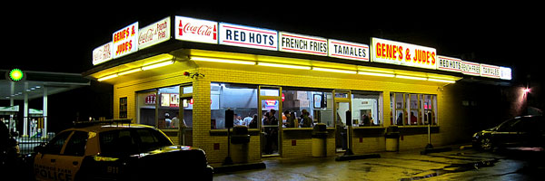 From the outset, my first visit to Gene & Jude's may have aroused more suspicion in this Chicago Catholic family than if I'd said I was going to go hang out at the local Krishna temple. I come from a long line of Superdawg devotees, dating back to that fine establishment's inception, and while other dogs may occasionally be introduced to the collective family gullet -- most notably at ballgames -- it's always with an implicit, "Hey, it's no Superdawg, but it'll do." Staying with family while visiting home, getting ready to head out the door, two independent conversations with my folks went like this: