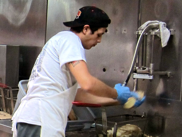 The minimalism at Gene & Jude's goes beyond the dog itself. Part of what's so refreshing about the place is that it doesn't have loftier aspirations. It's content to serve hot dogs, fries, and the occasional Supreme Tamale. Don't ask for ketchup. Not even for the fries. Doing so will get you laughed at and sent to the McDonald's across the street. But this is a perfect example of do less, do it better. Even at midnight, a small army of teenagers stands at the ready, and though this is a brigade that would make Escoffier wince, what the fellas may lack in economy they make up for in energy, bounding around and spitting out dogs at the pace necessary to keep up with the often formidable line, a dozen deep even at this late hour. A narrow counter for eating lines one wall and most of the front windows, though back at the car seems to be an equally popular spot to park and tuck in. We placed our order. We got our drinks. The same kid who took our order handed me an already greasy paper bag. We took it to the counter, got everything unwrapped, and had ourselves a pretty outstanding meal.