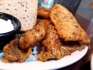 The fish fry evoked some childhood memories of my father bringing home a pile of lake perch, dusting them with flour and slapping them in a cast iron pan with butter and Crisco. Lake perch are more than a little difficult to come by these days, and though it's been a long time I doubt these were the perch of my childhood, but McBob's fish fry is awfully tasty nonetheless. Deep fried, in a thin, crisp and heavily seasoned coat, the fish is flaky and moist and -- when you get the super combo that includes perch, walleye and grouper -- a great object lesson for a four year old ("White fish doesn't always taste the same!"). Fries would be the safe choice, but potato pancakes seemed a whole lot more interesting, and they were... thick with an almost creamy texture, and if I weren't assured by the fellow helping us that there was no cheese involved, I would have thought they'd slipped some in there. I'd ordinarily consider a non-crisp potato pancake a mortal sin, but against the crisply fried fish it actually kind of worked. Two for two at McBob's.