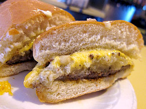Upon first tasting this remarkable sandwich -- the first butter burger for us all -- my ladylove leaned over and said, "I'm kind of shocked that this is a food." Which isn't to say that she disapproved. Or at least if she did, it was the doctor and not the diner talking. Rather, she loved it, as did I. But in this day and age, it's a little shocking to get this much butter on anything, much less something that's already pretty well set in the lipids department. The bun was warm and soft and otherwise nondescript, and the thin patty was, sadly, cooked to within an inch of its life (not that the menu didn't give us fair warning), but the heart and soul of this delicious beast was the gooey mass in the middle, comprised of onions, American cheese, and lots and lots of butter. The onions weren't griddled, but rather chopped and "stewed," which meant that when combined with a high-moisture cheese and what must've been a quarter cup of butter, they made a kind of squishy, gooey, sweet and salty mass that oozed into every pore of both bun and beef. I found that just a tiny squirt of brown mustard, in classic yellow squeeze bottles on the counter, provided a touch of balance, though the burger was entirely capable of standing on its own. My ladylove took another bite, savored it, turned to me and said, "Don't you dare try making these at home." She's right, of course. They're far too dangerous.
