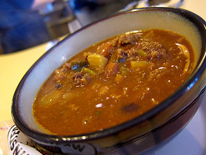 Solly's is a charming little place featuring two yellow, melamine, horseshoe-shaped counters seating a dozen each, behind which stands the kitchen and a small crew of ladies who are friendly and laid back and in absolutely no rush whatsoever, which for a place like this suits me just fine. It being the lunching hour, I zipped right past the breakfast offerings and, sadly, missed the rosti which I would have liked to have sampled. So instead I got a cup of chili, some fries and rings for the family to share, and butter burgers straight across the board... the standard variety, though the menu is stuffed with quite a few variations. The chili (avert your eyes, anti-bean folk!) was a house concoction, a touch watery -- more like thick soup with lots of ground meat and beans -- but lightly sweet and nicely seasoned with a great mix of spices. Fries were prefab and I'm pretty sure the rings were too, but they were fried up hot and crispy and did the trick, which is to say they provided an occasional respite in our attack on the butter burgers. Yes, to eat some fries and onion rings was to temporarily take the fat level down a notch.
