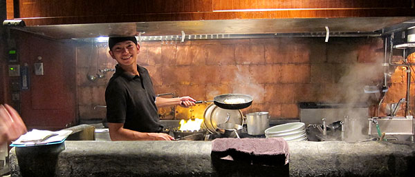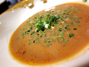 Though Gogyo has a few locations strewn throughout the city, the one I'd scouted is in Nishiazabu, in a very quiet (at this late hour, anyway) residential neighborhood off the main drag a short walk west of Roppongi station. It's a casual late night joint, though it isn't lacking for high design, hewn from black stone, the tables and counters made of thick slabs of wood with a deep, reddish lacquer, the walls covered with red tile and a gleaming hammered copper backsplash lining the entire rear wall of the open kitchen. It's a room that evokes fire and brimstone, and I smirked as I considered that the kitchen seemed more suited to a hunchbacked Oliver Reed with Uma Thurman on his arm than the fellow who actually manned it on this particular evening. As it turned out, however, this slight, smiley fellow was no less a master of fire. Though I missed the shot, upon ordering a bowl of the house special ramen, he'd start heating a large wok, and shortly thereafter a huge blast of six foot flames would jump out of it. When they died down he'd add the contents to the dish he was carefully constructing, and moments later a black bowl of soup would come out of the kitchen.