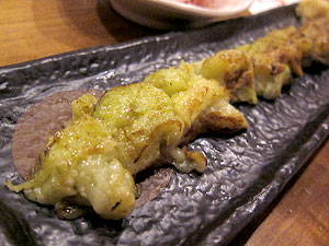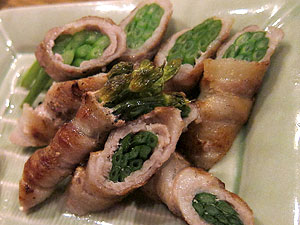 I'm still not sure what the center of this little package was, but the exterior was bacon, and that was enough of a selling point right there. From across the counter, I'd initially thought it was asparagus, but was told no, it was... something else. I didn't catch the name. They were long, thin green shoots, but upon closer inspection it was clear that the buds at the end were of a very different shape, and the stalks appeared to be hollow as well. The bacon was thick, much subtler than American bacon, not nearly so salty or smoky, but possessed of the requisite amount of cured pork fat that sizzled and melted on the grill, making for a crisp and juicy package once fully cooked. They do pigs about as well as they do cows in Japan, which is to say it was fabulous.