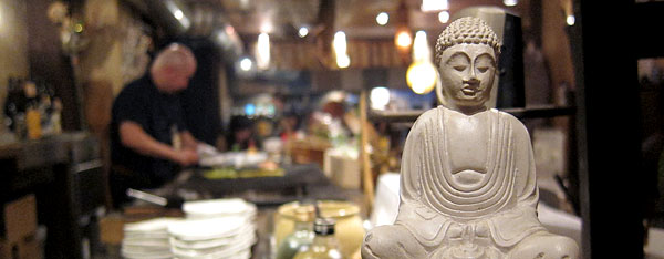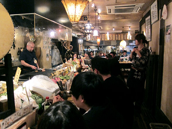 You're first hit by the warmth, as a huge charcoal grill is situated directly in front of the door, right in the middle of what can rightly be described as a cave of a restaurant. As your head crosses the threshold, the shouted greetings hit your ears, welcoming you in traditional fashion. As you start to stand up, sweet, intoxicating smoke hits your nose, and once you've regained your balance you finally see the source, an abundance of fresh vegetables and seafood proudly displayed in front of the massive grill, and the bald, friendly, solidly built fellow manning it. Half of the room is jammed with small tables, the other half comprised of the open kitchen and long bar curving around it, with low seating that may be a stool and may be a milk crate with a piece of carpet lashed to the top of it, depending on where you're parked. Low ceilings, acoustic tiles, the heat emanating from the grill and the complete lack of windows somehow manage to lend a vibe that's cozy more than claustrophobic (Here's a shot that gives a better sense of the space), like a hobbit hole of the Eastern tradition where you could nestle in and warm yourself with good food and spirits and company all night. So that's what we did.